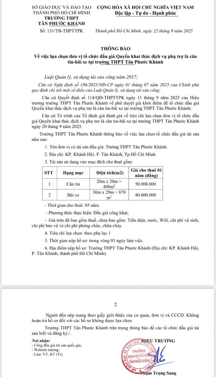THÔNG BÁO VỀ VIỆC LỰA CHỌN ĐƠN VỊ TỔ CHỨC ĐẤU GIÁ QUYỀN KHAI THÁC DỊCH VỤ PHỤ TRỢ LÀ CĂN TIN-BÃI XE TẠI TRƯỜNG THPT TÂN PHƯỚC KHÁNH